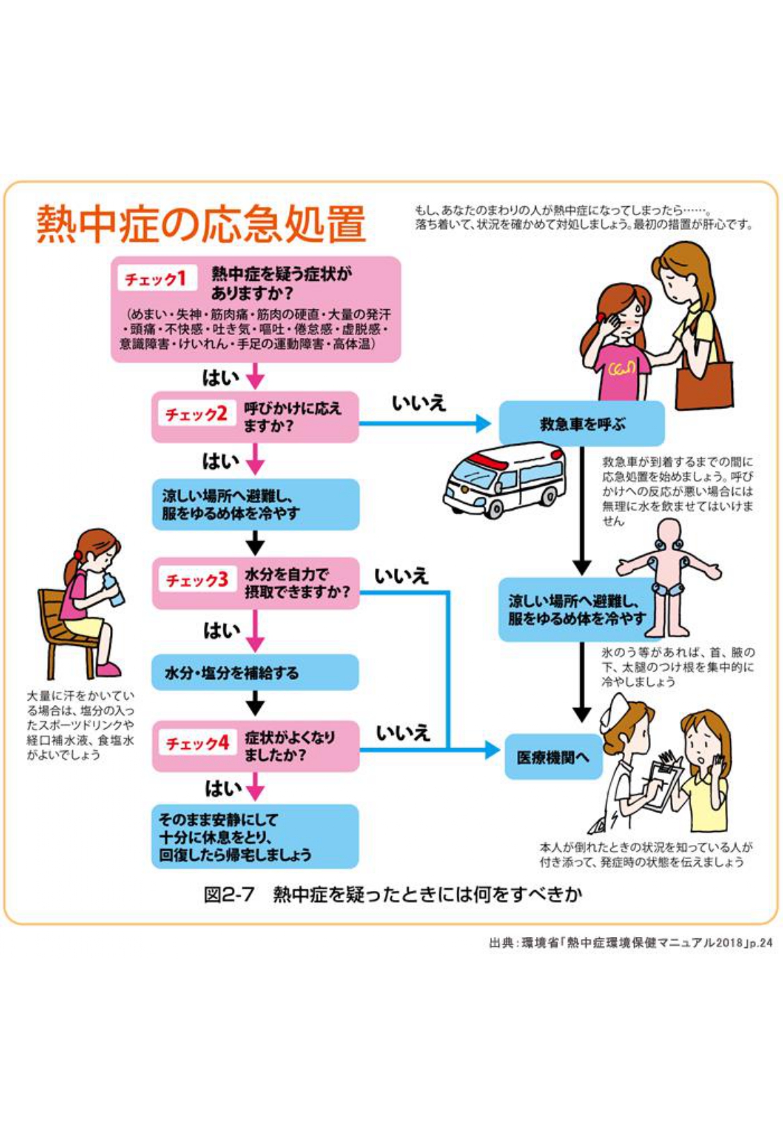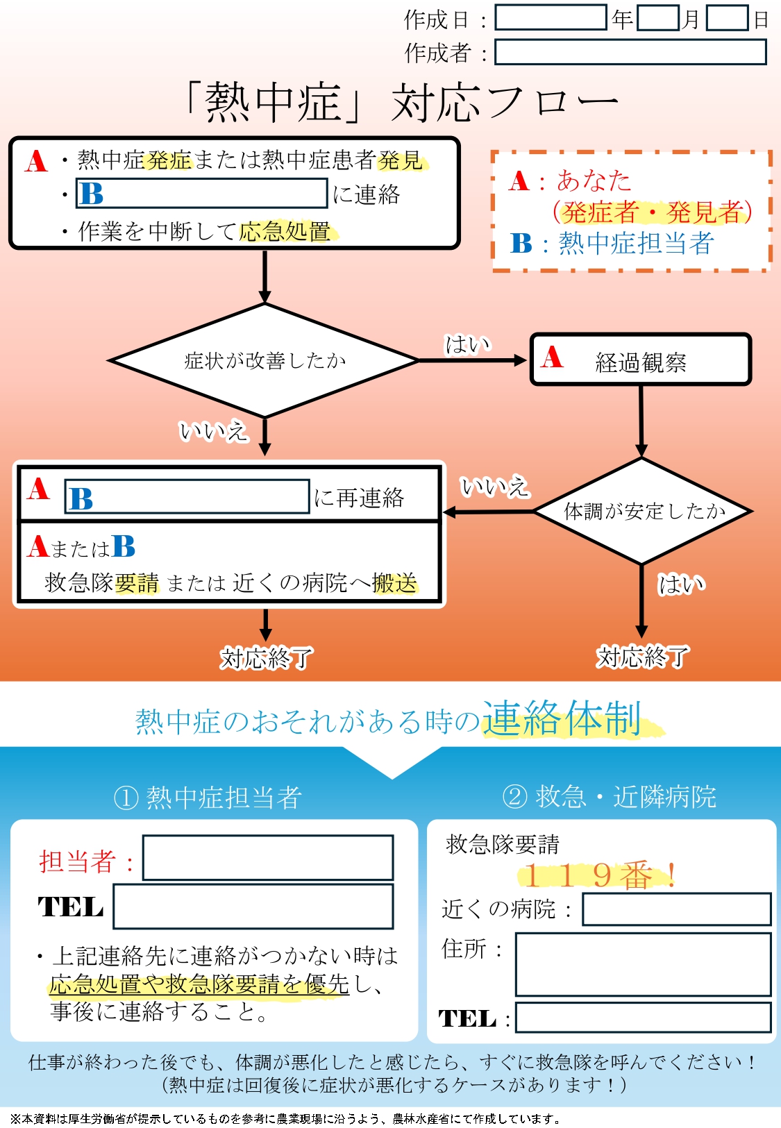 実際の農業現場における具体的な対応としては、必要事項を記載した「張り紙」を事務所等に掲示することが有効となります。つきましては、熱中症の予防に加え、熱中症が疑われる労働者を発見した場合の対応について事務所内で掲示し共有をお願いいたします。