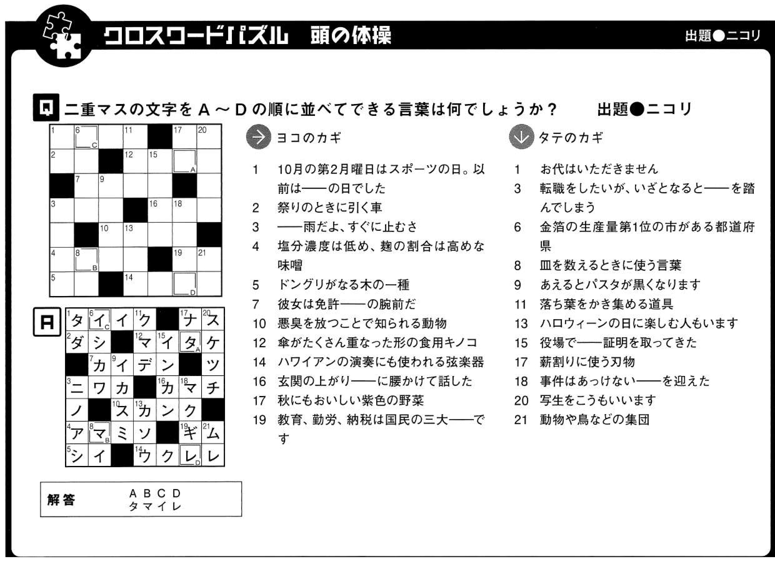 広報紙10月号のクロスワードパズルの答えを発表します。