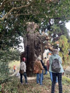 当日は冬晴れの下、滋賀県湖南市にあるJR三雲駅からボランティアガイドの説明を受けながら旧東海道を西に向けて出発。まずは、江戸時代に旅人の足元を照らし、目印となったと言われている常夜灯を起点とし、続いて弘法杉(こうぼうすぎ)と大沙川隧道(おおすながわずいどう)まで歩きました。「弘法杉(こうぼうすぎ)はその昔、弘法大使が昼食を取った後にこの地に杉の箸を刺し、今では大木となったと言い伝えられている」と聞くと、参加者らは下から見上げてその大きさを感じていました。その後も、ボランティアガイドの話に耳を傾け史跡をたどり、最終の見学地である酒蔵「北島酒造」に到着。1805年から続く酒蔵では、お酒ができるまでの工程や杜氏の仕事を見学し、販売所では水琴窟(すいきんくつ)の音色を聴きながら地酒の試飲をし、日本酒や酒かすなどの買い物を楽しんだ後、ゴール地点のJR甲西駅まで約5㎞を歩きました。