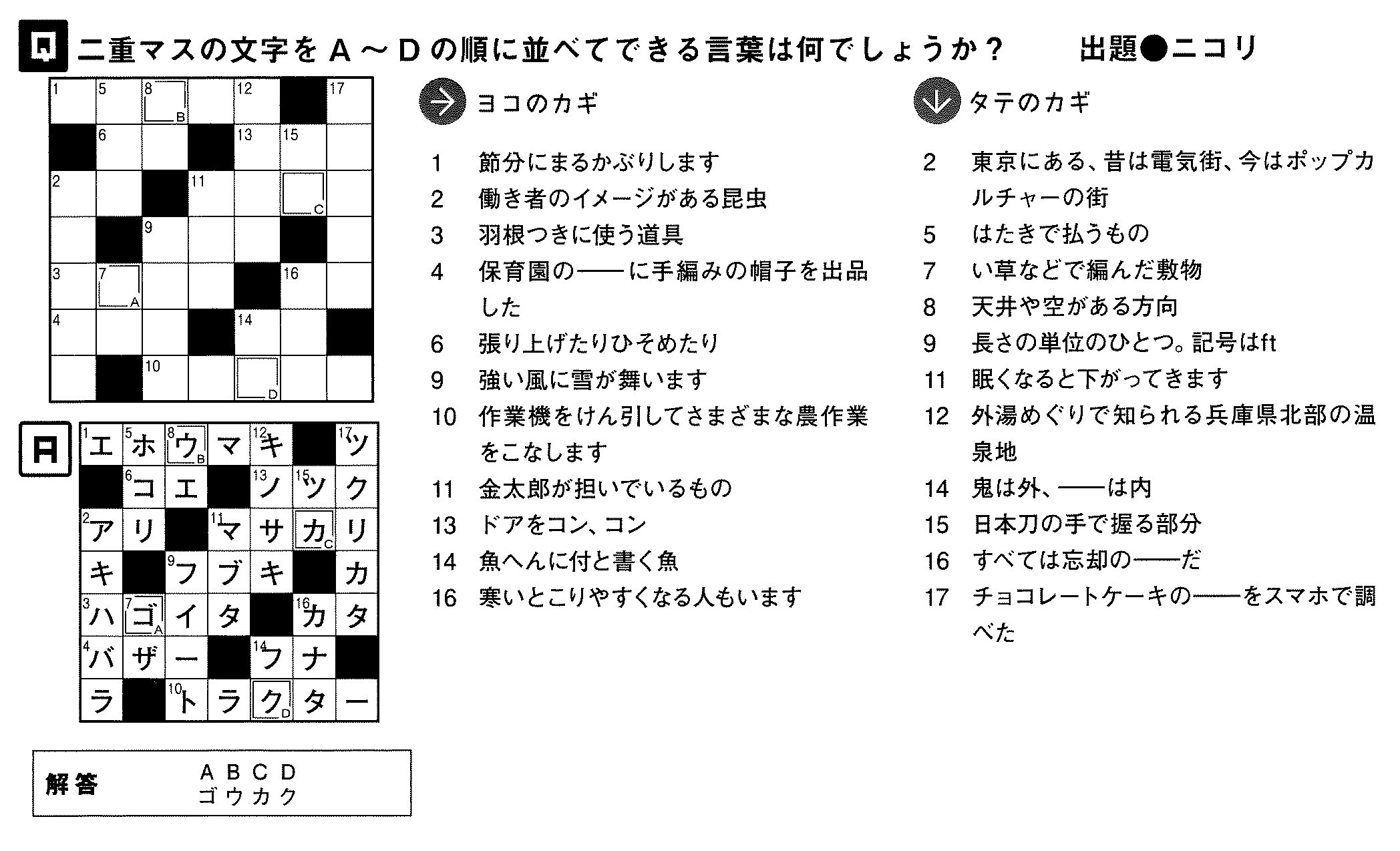 広報紙2月号のクロスワードパズルの答えを発表します。